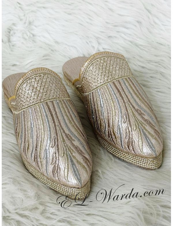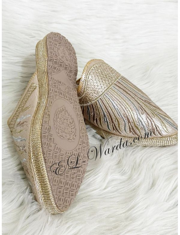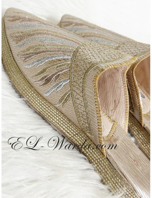 Babouche bronze avec une broderie en fil bronze doré et argenté d'origine de Fès au Maroc C'est une babouche qui se porte avec les habits traditionnels (caftans...) marocains, mais qui se mariera très bien avec des robes lors des sorties en soirée ou pendant les fêtes.